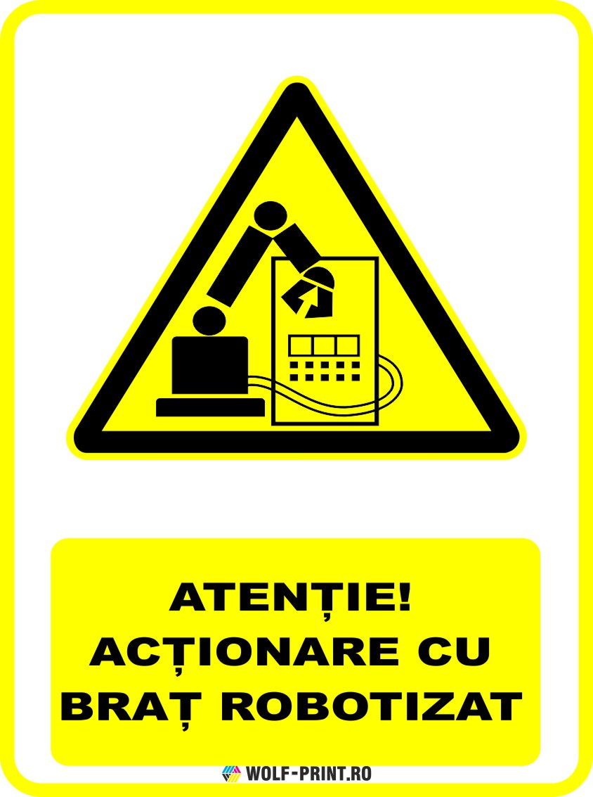 Indicatorul de avertizare Actionare cu brat robotizat de la Wolf-Print.ro este conceput pentru a semnaliza clar si vizibil zonele cu risc maxim in zone industriale, birouri, scoli, depozite sau spatii comerciale.
