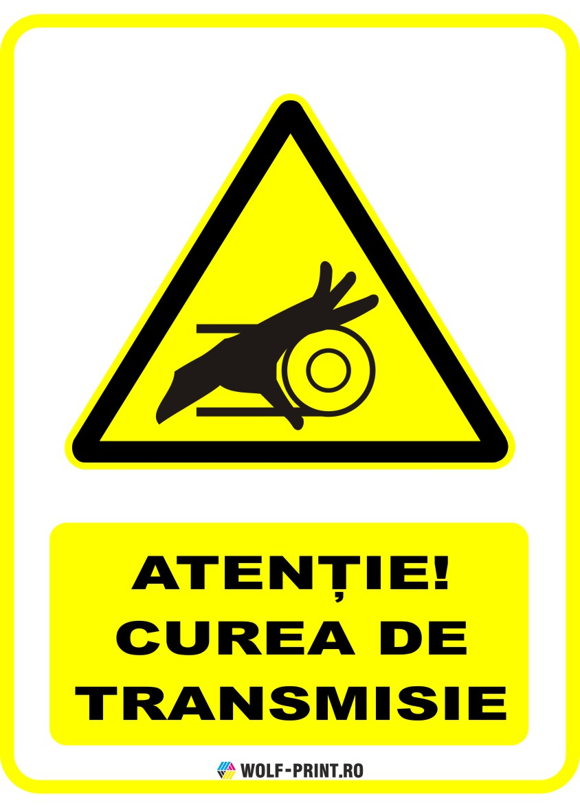 Indicator de avertizare Curea de transmisie, realizat din materiale durabile, pentru interior si exterior. Aplicare usoara pe suprafete curate, fara praf, uleiuri, grasimi sau silicon. Calitate profesionala Wolf-Print.ro.