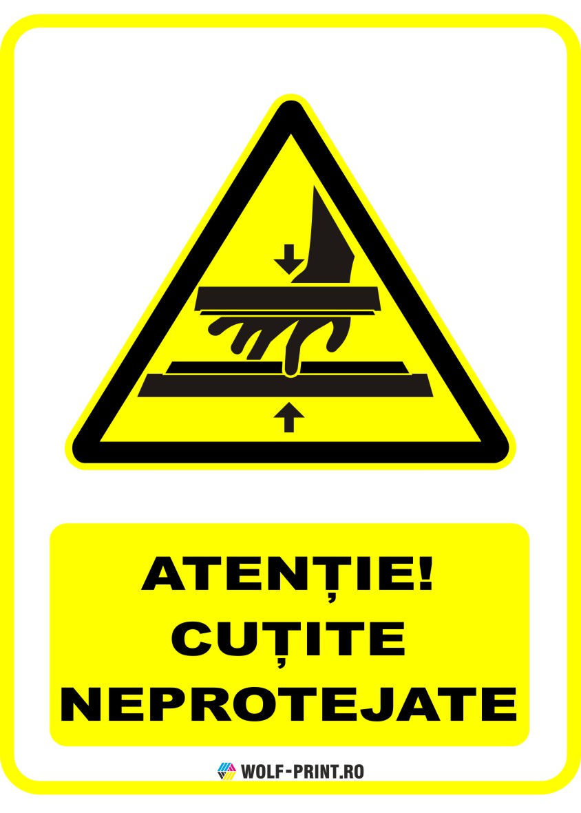 Indicator de avertizare Cutite neprotejate, realizat din materiale durabile, pentru interior si exterior. Aplicare usoara pe suprafete curate, fara praf, uleiuri, grasimi sau silicon. Calitate profesionala Wolf-Print.ro.