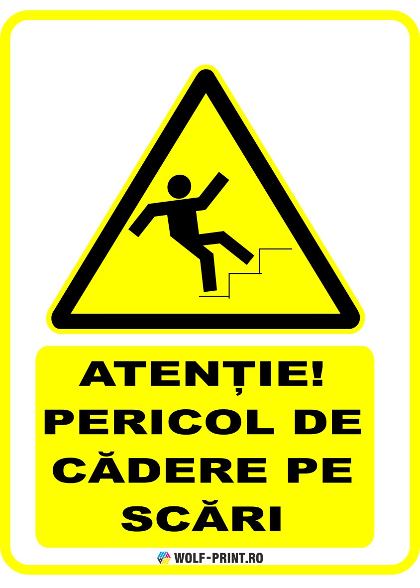 Indicator de avertizare Pericol de cadere pe scari, realizat din materiale durabile, pentru interior si exterior. Aplicare usoara pe suprafete curate, fara praf, uleiuri, grasimi sau silicon. Calitate profesionala Wolf-Print.ro.