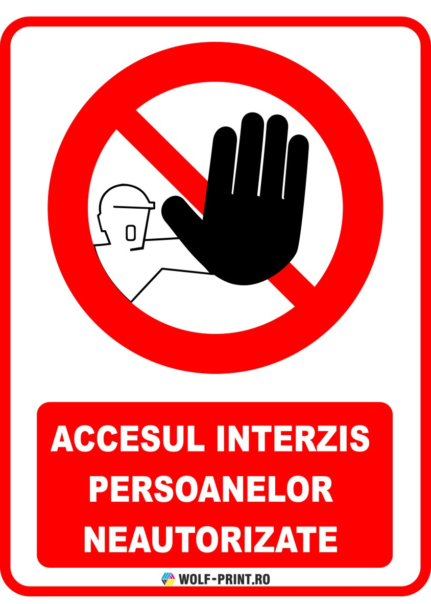 Indicator de interzicere Accesul interzis persoanelor neautorizate , realizat din materiale durabile, pentru interior si exterior. Aplicare usoara pe suprafete curate, fara praf, uleiuri, grasimi sau silicon. Calitate profesionala Wolf-Print.ro.