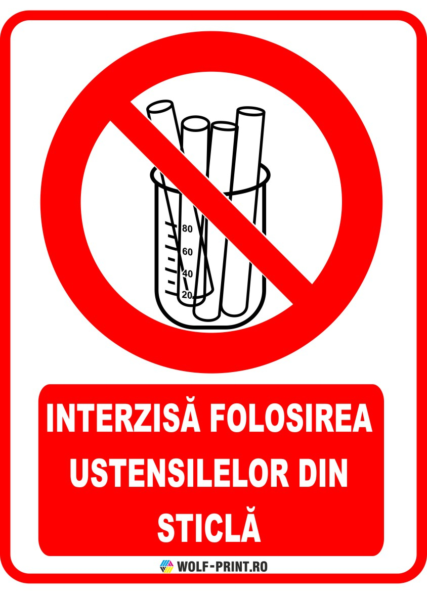 Acest indicator de interzicere, Interzisa folosirea ustensilelor din sticla de la Wolf-Print.ro este conceput pentru a semnaliza clar actiuni interzise in spatii publice, industriale sau private, asigurand siguranta si respectarea regulilor.