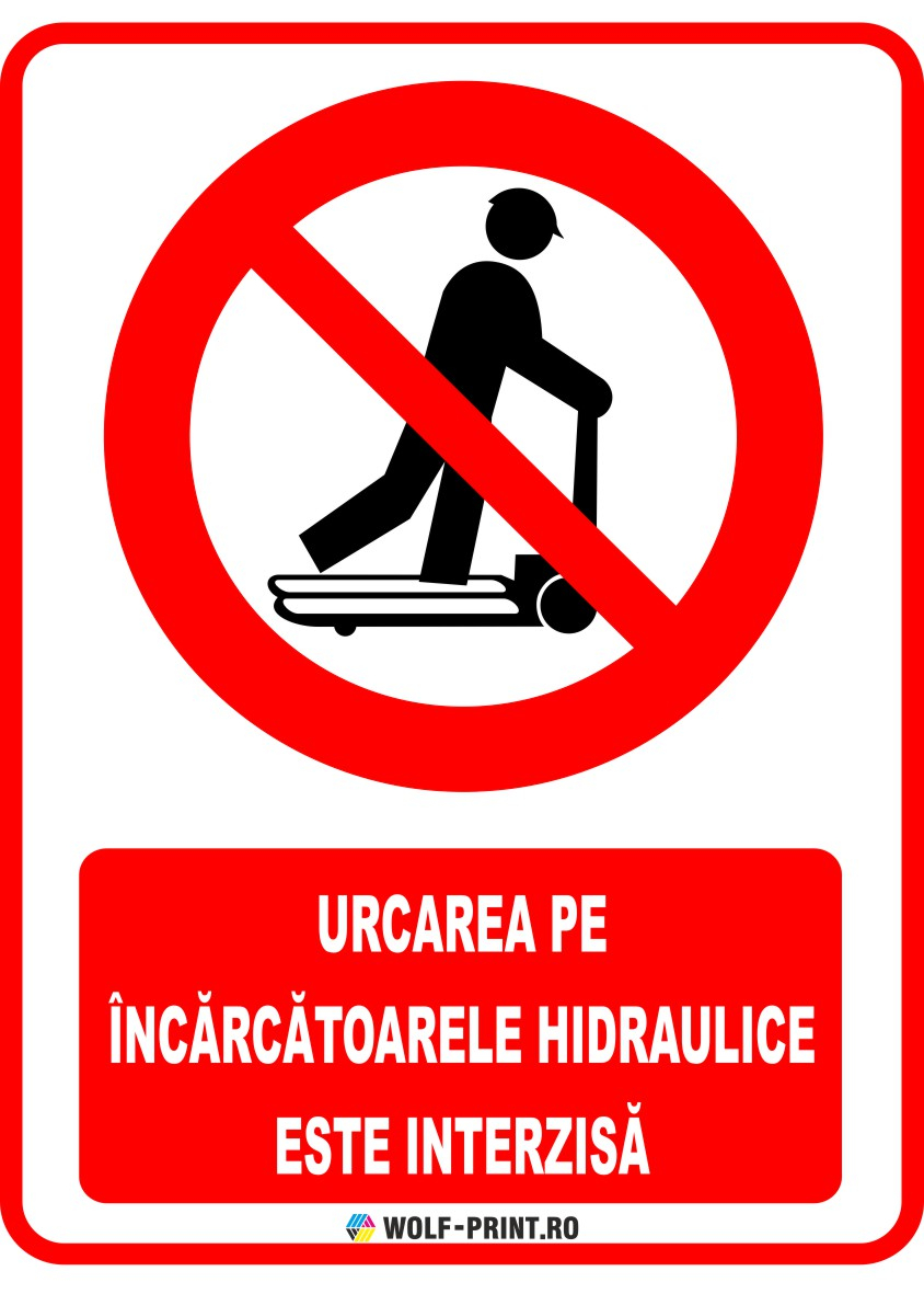 Acest indicator de interzicere, Urcarea pe incarcatoarele hidraulice este interzisa de la Wolf-Print.ro este conceput pentru a semnaliza clar actiuni interzise in spatii publice, industriale sau private, asigurand siguranta si respectarea regulilor.