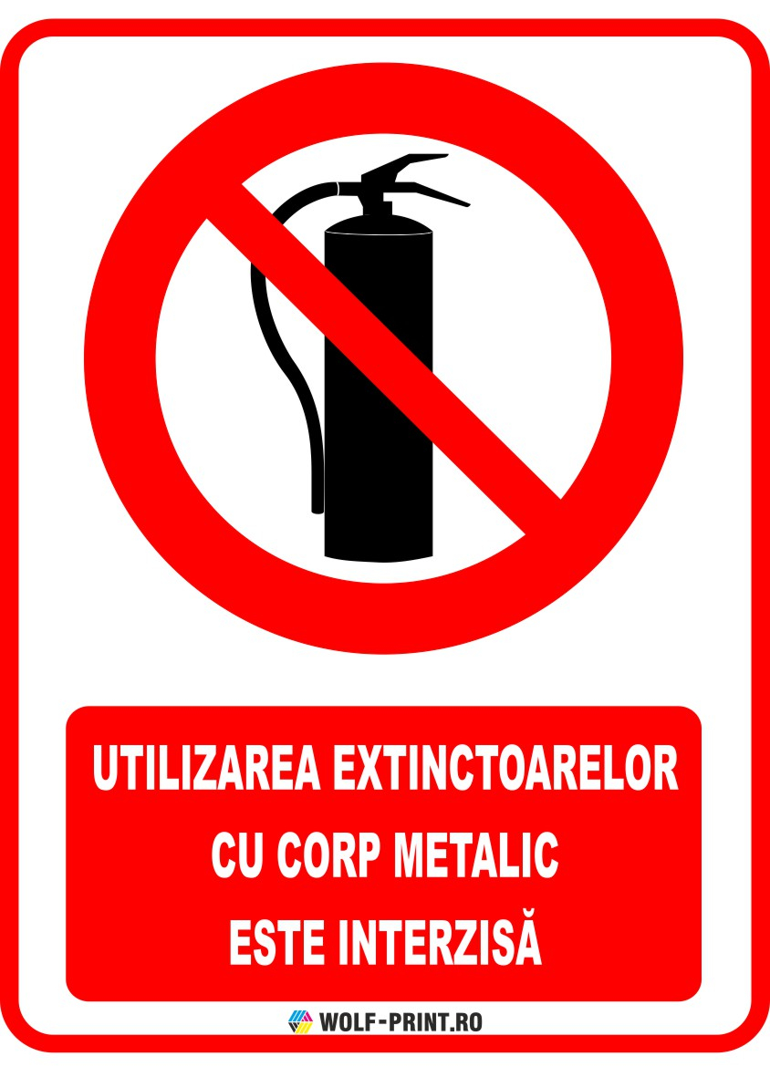 Acest indicator de interzicere, Utilizarea exctintoarelor cu corp metalic este interzisa de la Wolf-Print.ro este conceput pentru a semnaliza clar actiuni interzise in spatii publice, industriale sau private, asigurand siguranta si respectarea regulilor.