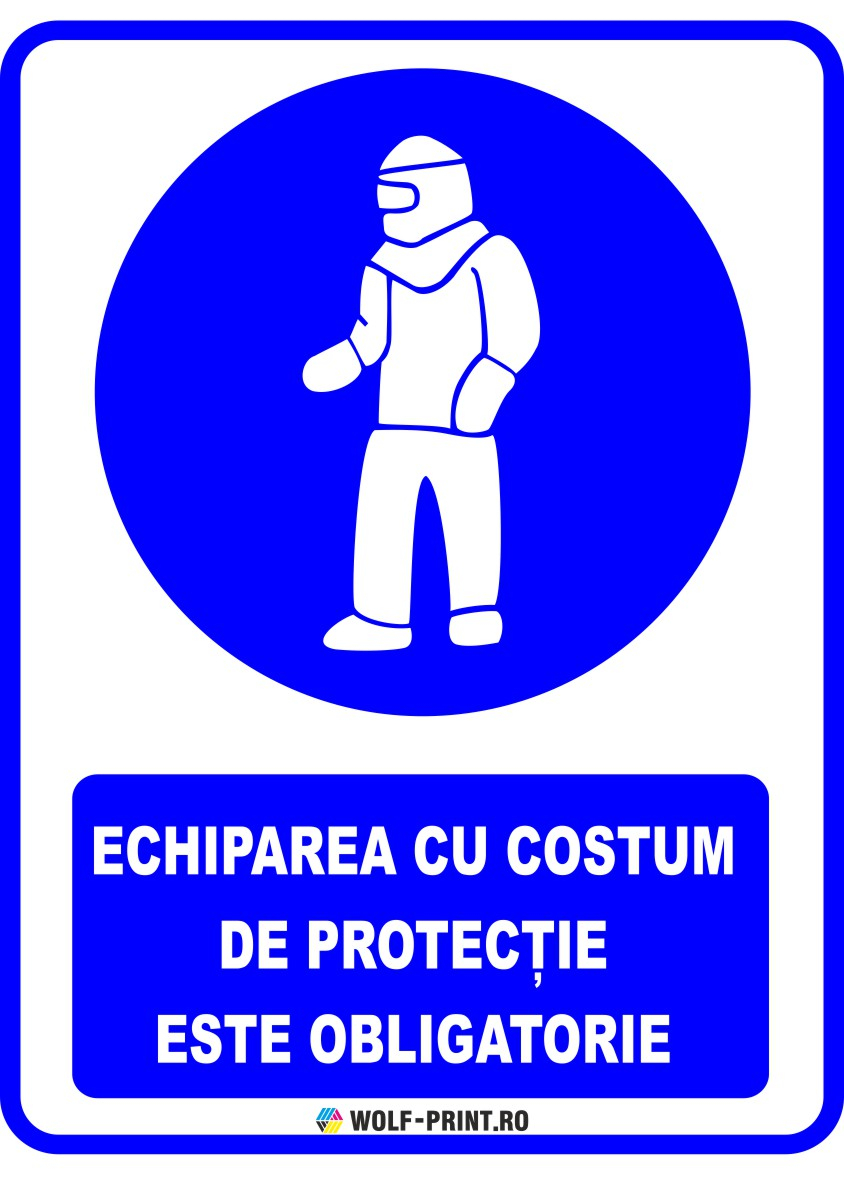 Indicator de obligativitate Echiparea cu costum de protectie este obligatorie de la Wolf-Print.ro este conceput pentru a semnaliza clar actiuni care trebuie respectate in spatii publice, industriale sau comerciale, contribuind la siguranta si respectarea normelor legale.