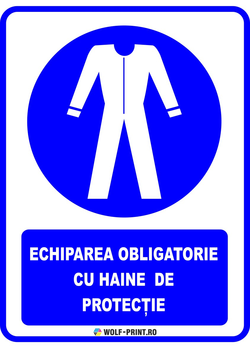 Indicator de obligativitate Echiparea obligatorie cu haine de protectie de la Wolf-Print.ro este conceput pentru a semnaliza clar actiuni care trebuie respectate in spatii publice, industriale sau comerciale, contribuind la siguranta si respectarea normelor legale.