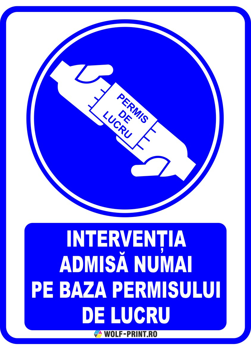 Indicator de obligativitate Interventia admisa numai pe baza permisului de lucru de la Wolf-Print.ro este conceput pentru a semnaliza clar actiuni care trebuie respectate in spatii publice, industriale sau comerciale, contribuind la siguranta si respectarea normelor legale.