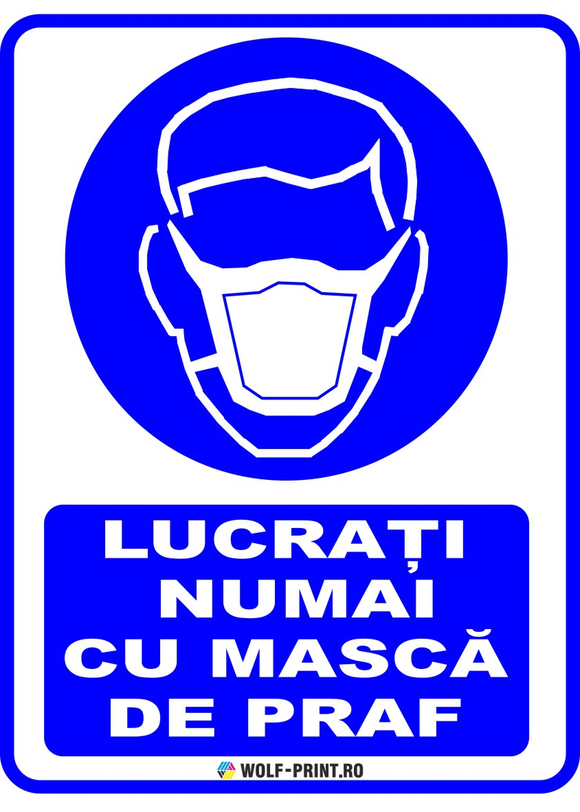 Indicator de obligativitate Lucrati numai cu masca de praf, realizat din materiale durabile, pentru interior si exterior. Aplicare usoara pe suprafete curate, fara praf, uleiuri, grasimi sau silicon. Calitate profesionala Wolf-Print.ro.