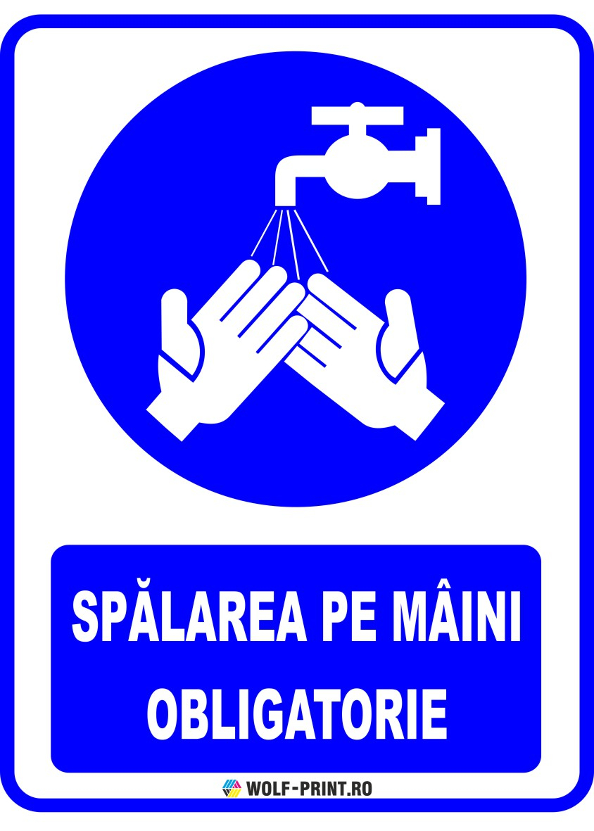 Indicator de obligativitate Spalarea pe maine obligatorie, realizat din materiale durabile, pentru interior si exterior. Aplicare usoara pe suprafete curate, fara praf, uleiuri, grasimi sau silicon. Calitate profesionala Wolf-Print.ro.