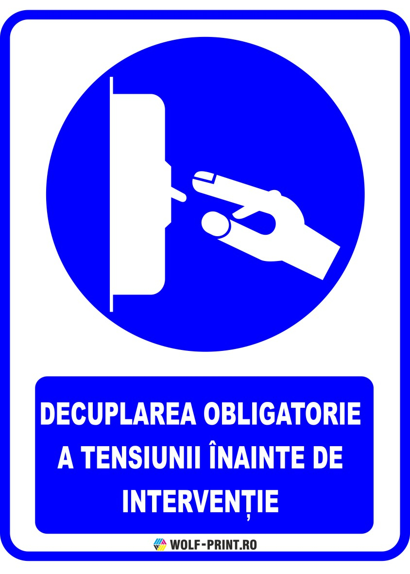 Indicator de obligativitate Decuplarea obligatorie a tensiunii inainte de interventie de la Wolf-Print.ro este conceput pentru a semnaliza clar actiuni care trebuie respectate in spatii publice, industriale sau comerciale, contribuind la siguranta si respectarea normelor legale.