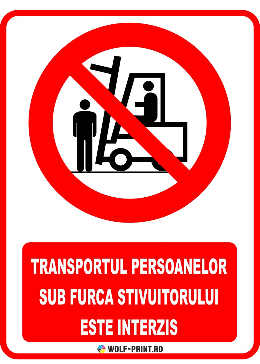Indicator de interzicere Interzis transportul persoanelor sub furca stivuitorului , realizat din materiale durabile, pentru interior si exterior. Aplicare usoara pe suprafete curate, fara praf, uleiuri, grasimi sau silicon. Calitate profesionala Wolf-Print.ro.