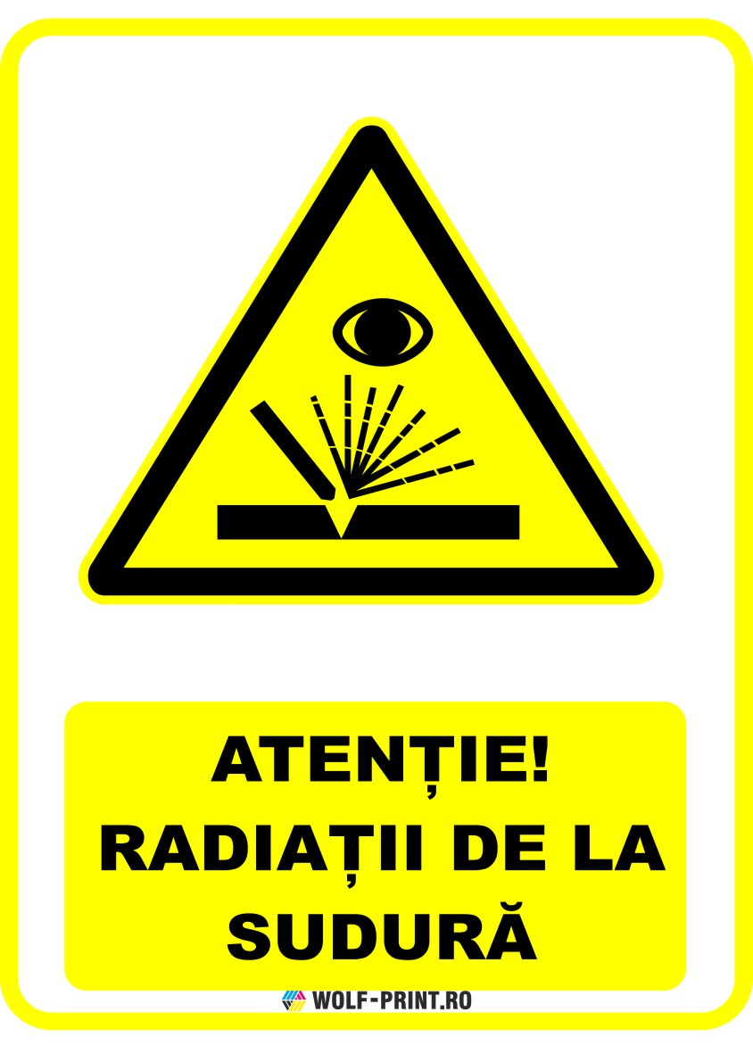 Indicatorul de avertizare Radiatii de la sudura de la Wolf-Print.ro este conceput pentru a semnaliza clar si vizibil zonele cu risc maxim in zone industriale, birouri, scoli, depozite sau spatii comerciale.