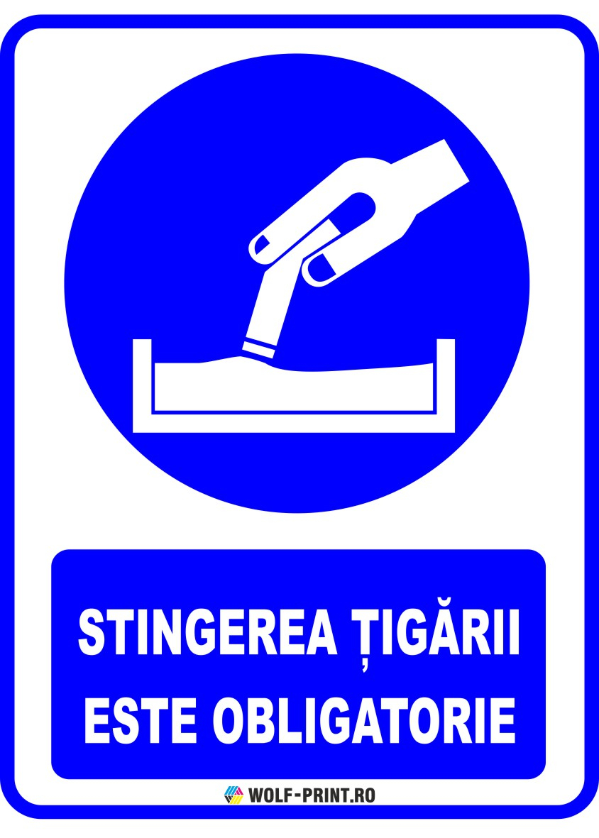 Indicator de obligativitate Stingerea tigarii este obligatorie, realizat din materiale durabile, pentru interior si exterior. Aplicare usoara pe suprafete curate, fara praf, uleiuri, grasimi sau silicon. Calitate profesionala Wolf-Print.ro.
