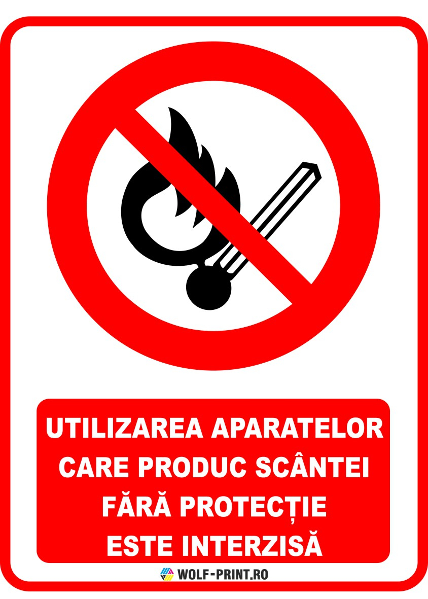 Acest indicator de interzicere, Utilizarea aparatelor care produc scantei de la Wolf-Print.ro este conceput pentru a semnaliza clar actiuni interzise in spatii publice, industriale sau private, asigurand siguranta si respectarea regulilor.