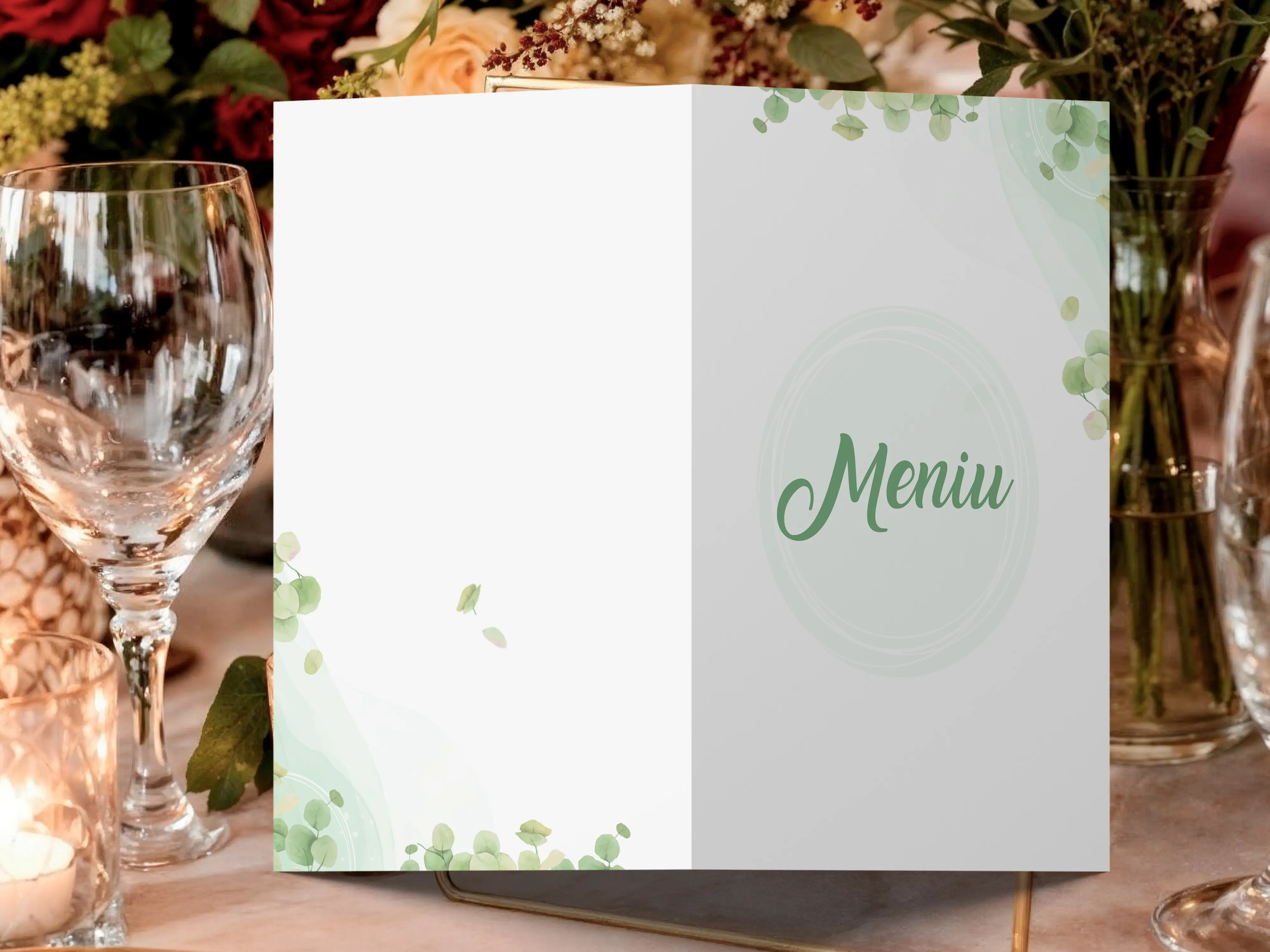 Meniul de nunta model 1 are un design floral elegant, potrivit pentru nunti romantice si evenimente rafinate. Layoutul aerisit permite afisarea clara a preparatelor si bauturilor servite invitatilor.