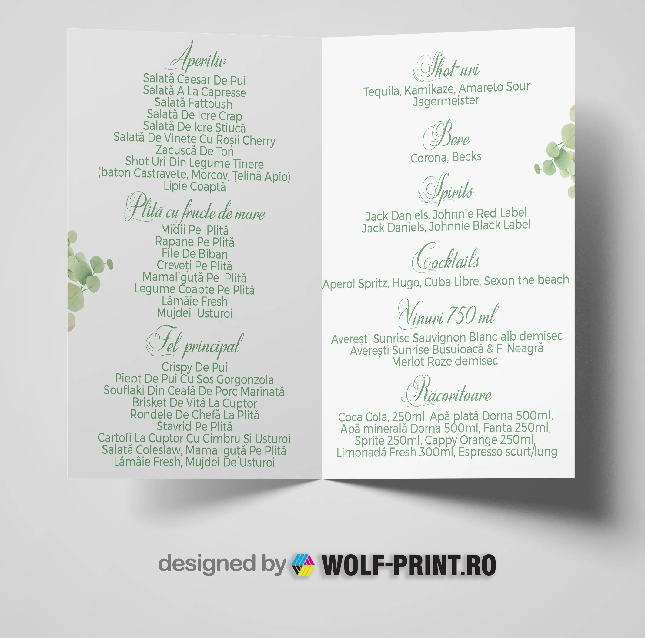 Meniurile de nunta personalizate realizate de wolf-print.ro sunt create pentru a completa elegant decorul meselor si pentru a prezenta invitatilor preparatele servite la eveniment.