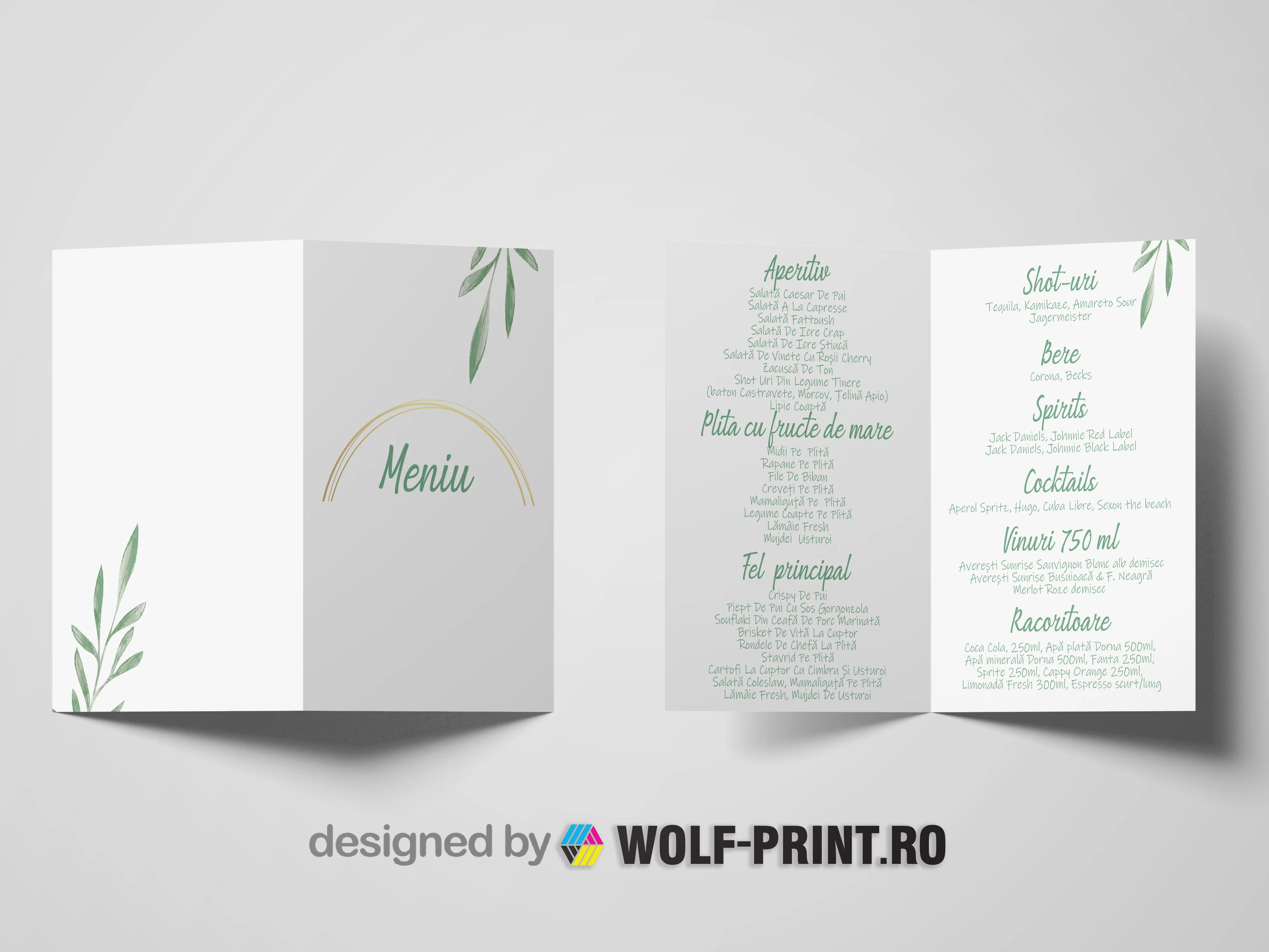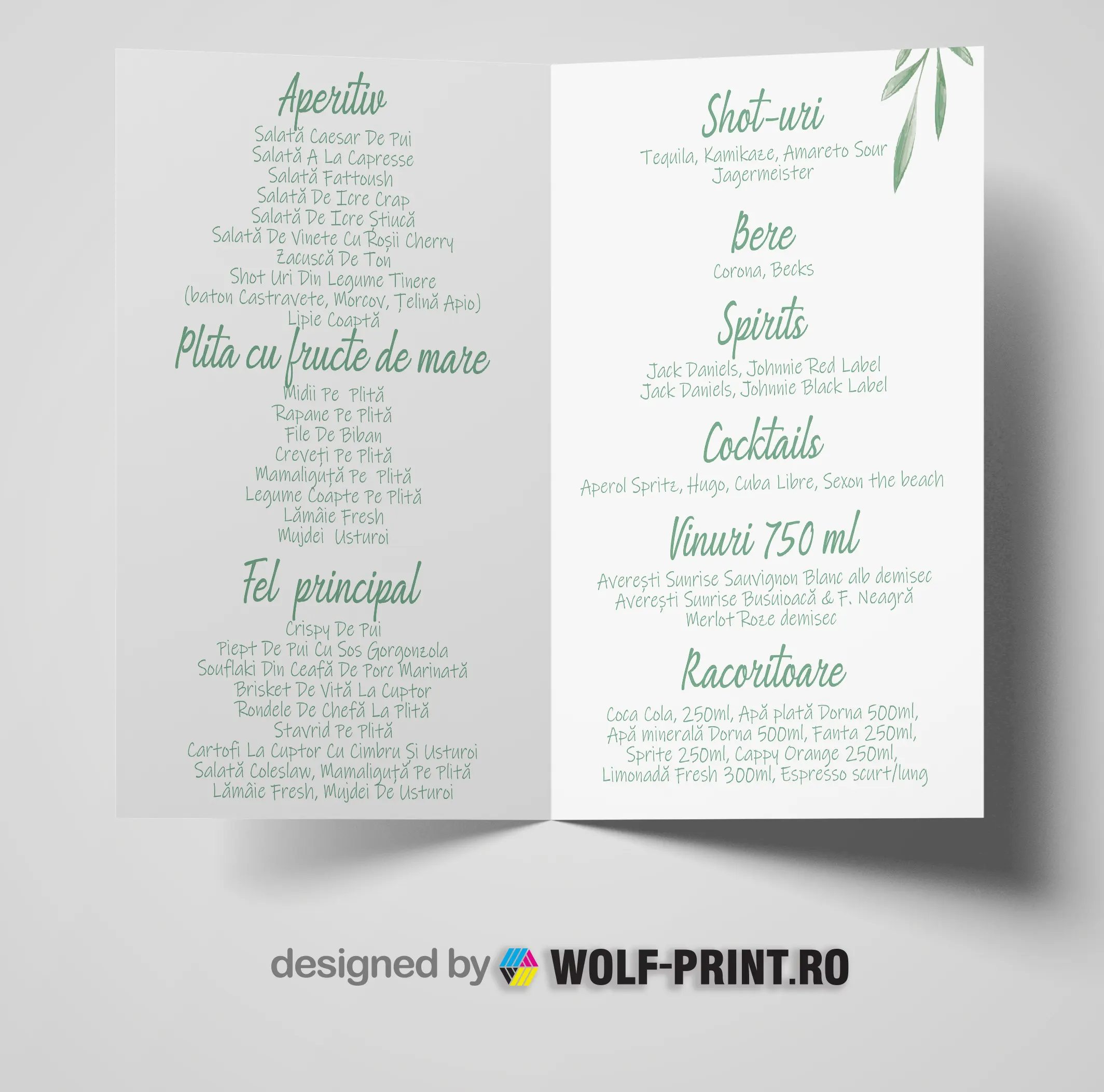 Meniurile realizate de wolf-print.ro completeaza decorul meselor si prezinta invitatilor preparatele servite.