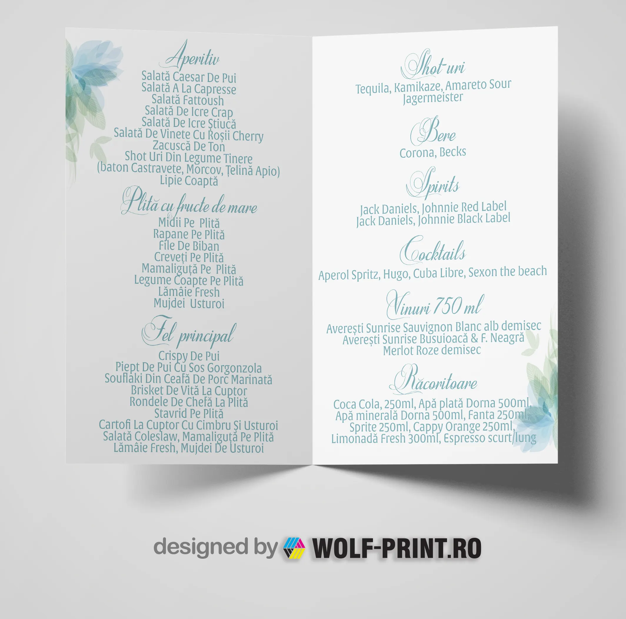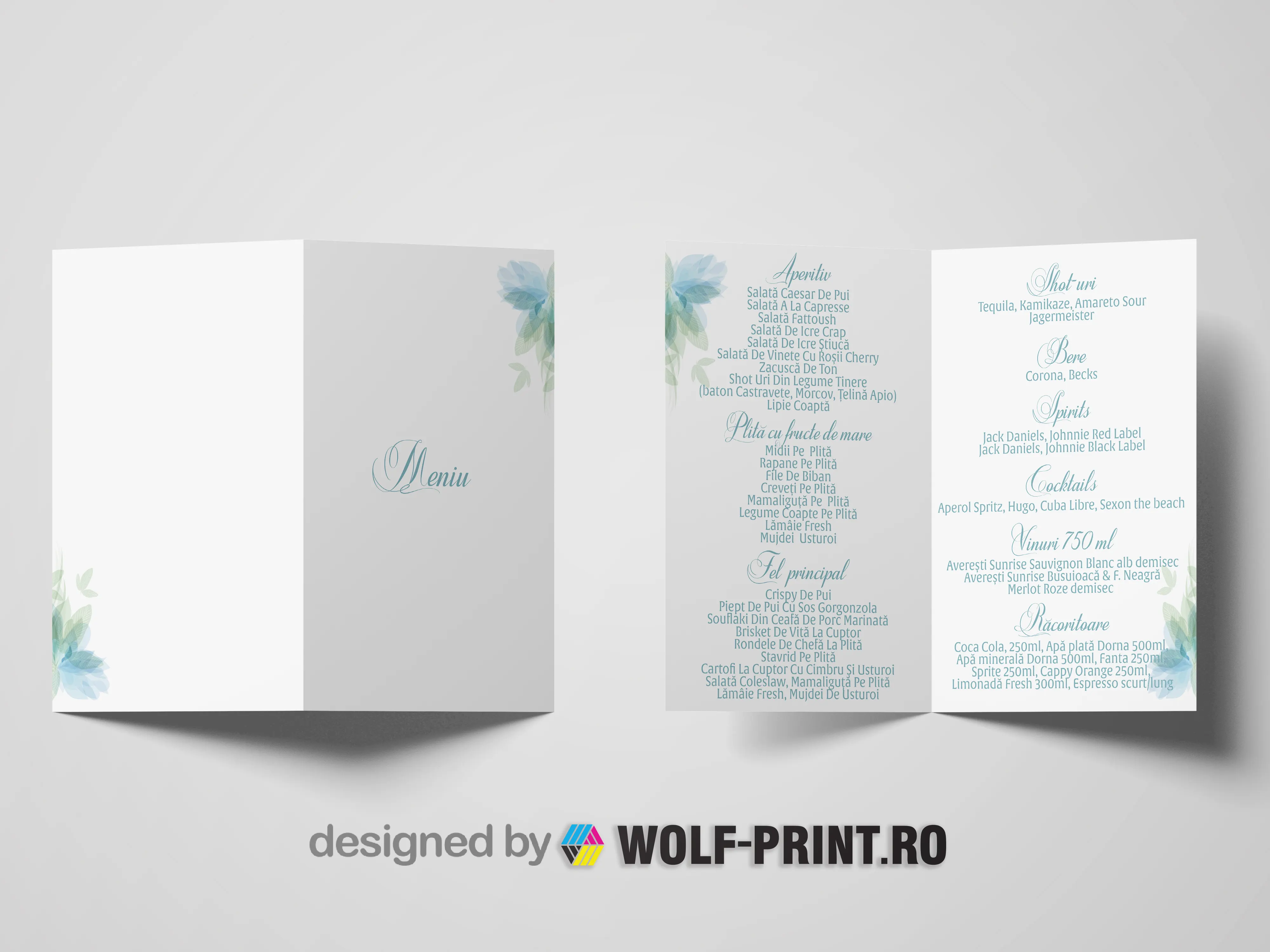 Meniurile de nunta personalizate realizate de wolf-print.ro completeaza decorul meselor si prezinta invitatilor preparatele servite la eveniment.